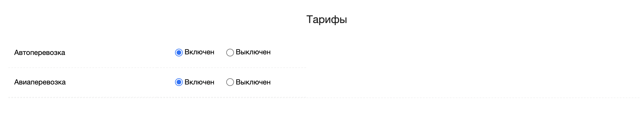 В данном разделе пользователь может включить нужные тарифы для расчета.