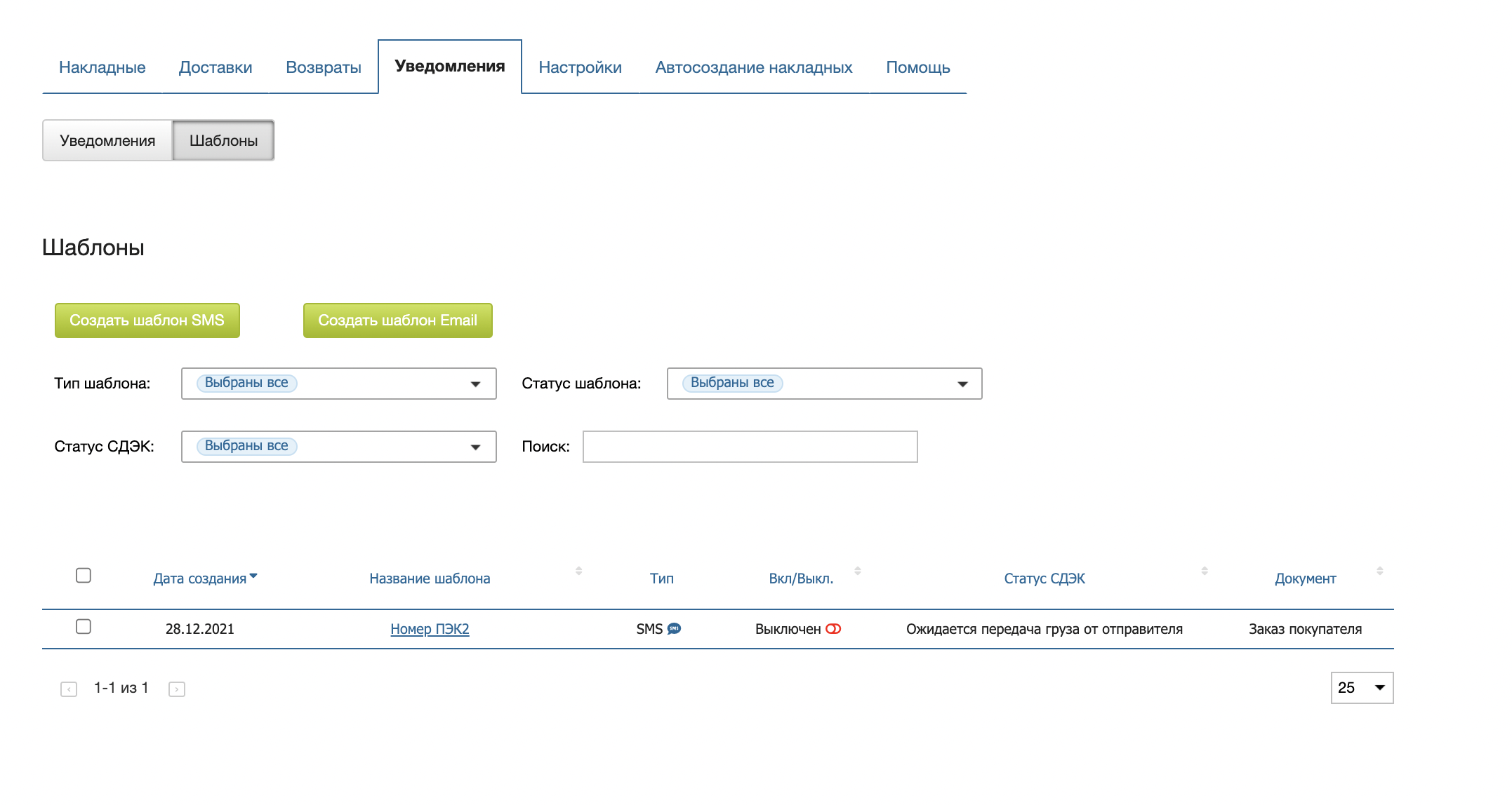 Для управления шаблонами необходимо переключиться на вкладку Шаблоны в разделе Уведомлений