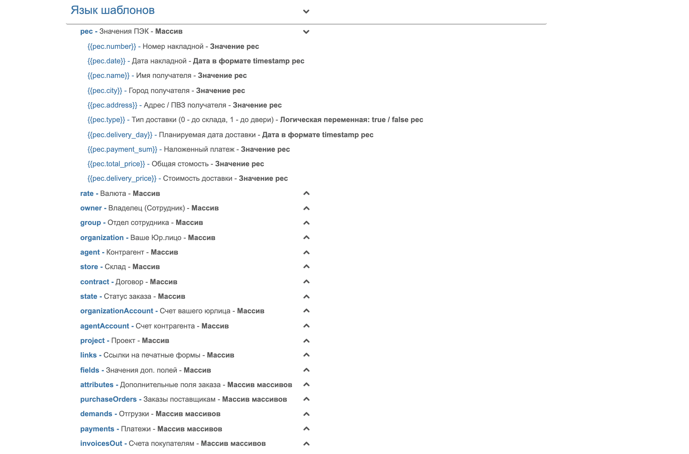 При создании шаблона для подстановки значений (например, сумма заказа, статус заказа, номер накладной) используйте язык шаблонизатора Liquid и подсказки Языка Шаблонов.