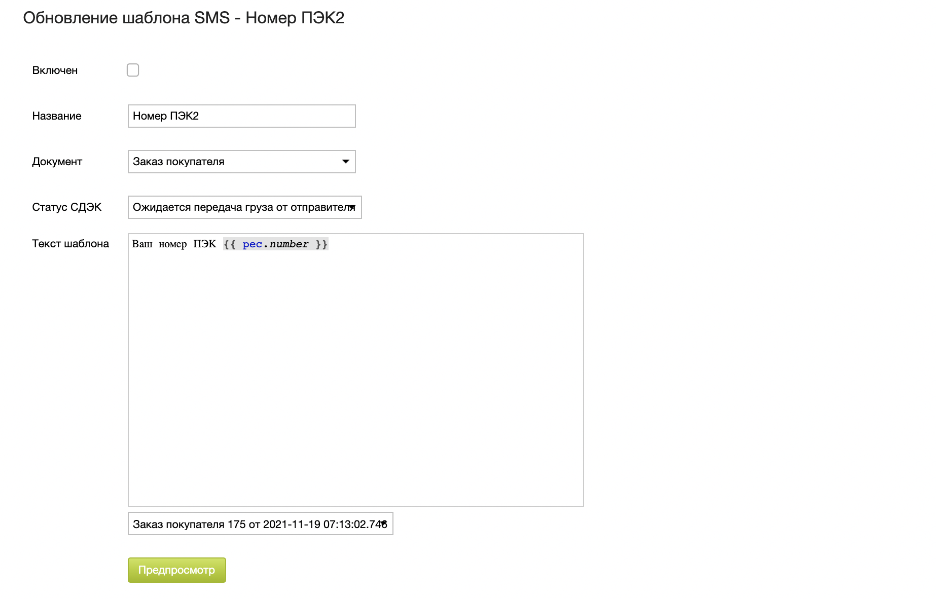 - статус шаблона (включен или выключен)