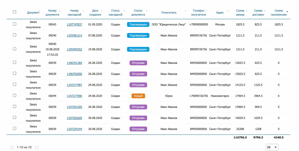 Пользователь может отфильтровать созданные накладные по