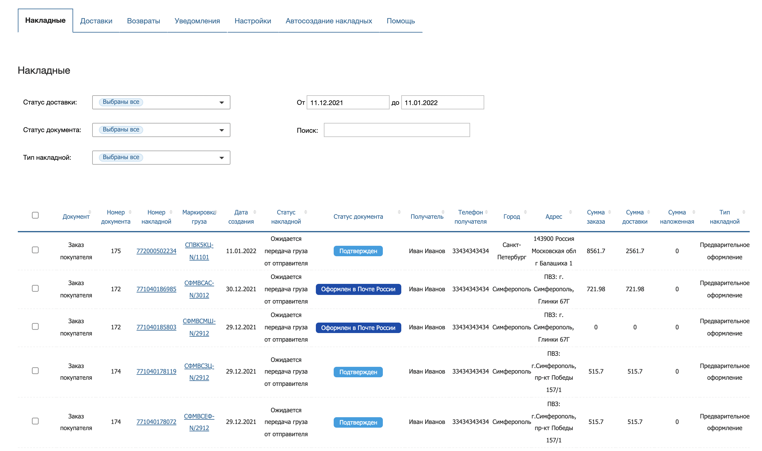 Во вкладке Накладные отображаются все созданные через виджет и автоматическое создание накладные, их текущие статусы, данные по доставке, суммарные стоимости наложенного платежа и т.д.
