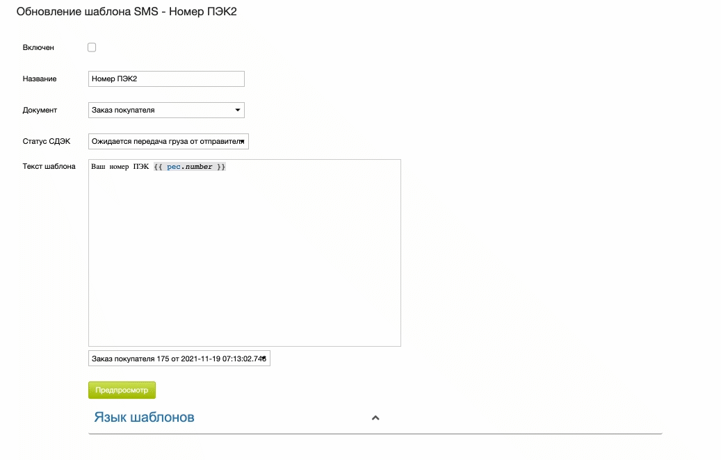 - статус шаблона (включен или выключен)