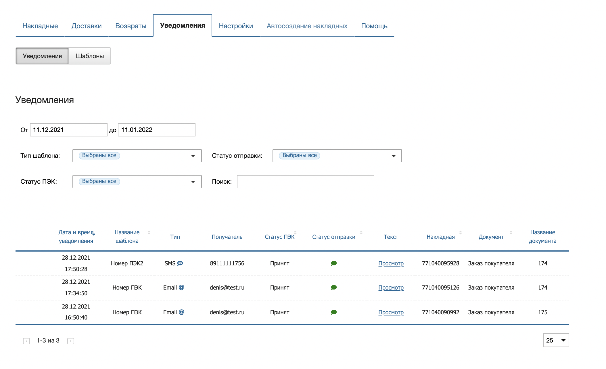 - статусу доставки ПЭК