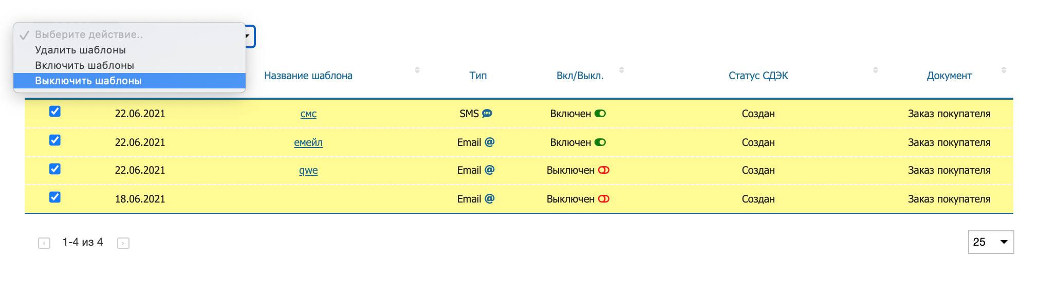 Для управление шаблонами необходимо выделить их галочками и выбрать необходимое действие (включение, выключение, удаление).