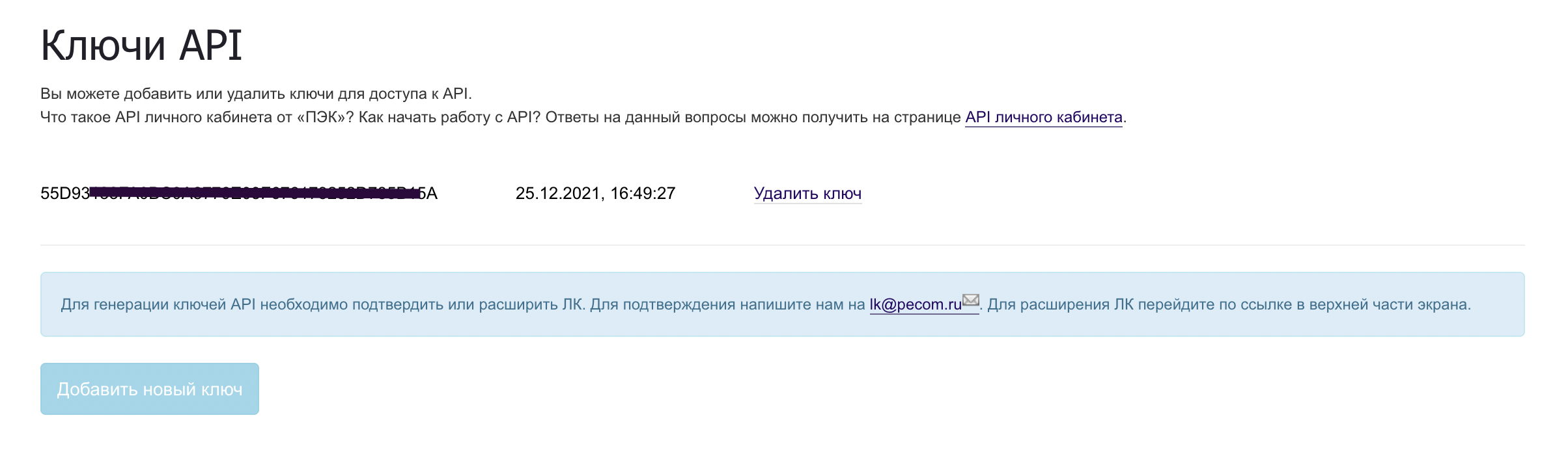 Для работы с приложением вам потребуются зарегистрироваться на сайте ПЭК и получить ключи API личного кабинет ПЭК.